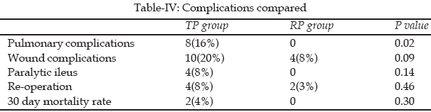 Operation complications were also compared in both groups. (Table-IV) There was no pulmonary complication in RP group but four were assessed in TP group p=0.02). Wound complications (infection, bulging, incisional hernia, incisional pain) were observed in 10 (20%) patients in TP group but observed in four (8%) in RP group (p=0.09). In TP group paralitic ileus was observed in four (8%) patients however no paralitic ileus occured in RP group (p=0.14). Patients undergoing re-operation were more in TP group (TP four (8%) vs RP two (3%), p=0.46). Two patient (TP n:1) underwent re-operation for graft thrombosis and four patients (RP n:2, TP n:2) for anastomotic bleeding The operative mortality was only two (1.53 %) in 30 day follow up period. Mortality occured in TP group because of myocardial infarction. Statistical analyzes were performed for the comparision of complications. Only two parameters (pulmonary complications) were significiantly lower in RP group. Other complications were also lower in RP group neverthless significiant difference wasn’t analyzed.