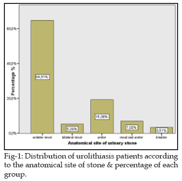Anatomical distribution of urinary stone and its correlation to serum MDA, GPx and CAT: The patients were divided into five groups according to the anatomical site of the stone in consideration on unilateral or bilateral stones. Renal stones (unilateral or bilateral) have found in 70.17% of patients and ureteric stones in 19.30%. Details of the anatomical distribution of the urinary stones is given in (Fig-1)