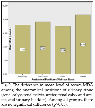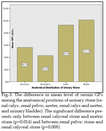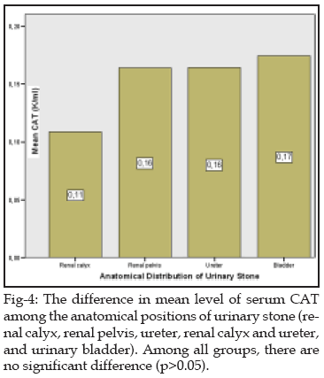 Another anatomical distribution of urinary stone had been identified regardless of the unilateralist or bilateralism to restrict the exact correlated anatomical site to mean serum level of MDA, GPx and CAT, so the patients were grouped into four anatomical positions. These have included the stone in renal calyx, renal pelvis, ureter, and urinary bladder. This anatomical distribution has revealed no significant difference in the mean serum levels of MDA and CAT among urinary stone in renal calyx, renal pelvis, ureter, and urinary bladder (p>0.05). There has been a significant difference in GPx level in serum of uretric stone patients in comparison to its level in serum of renal caliceal and renal pelvic stone patients. Also, the difference in mean of GPx has presented significantly in comparison of vesical stone to renal pelvic and renal calyceal stones. These results are shown in (Fig-2&4).