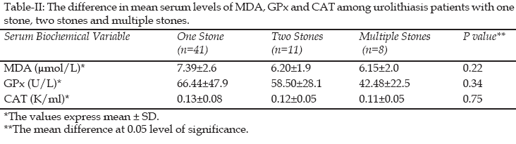 The correlation of stones number, stones size, and duration of urolithiasis disease to serum levels of MDA, GPx and CAT: The current study has revealed 68.3% of urolithiasis patients have had one stone, two stones in 18.3%, and multiple stones in 13.3%. However, there has been no difference in mean serum levels of MDA and GPx in patients with one stone, two or multiple stones (Table-II)