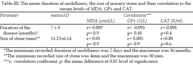 The duration of the disease represents the time when the patient are aware of the symptoms of urolithiasis till presentation. The mean duration of urolithiasis has been seven months. It has revealed no correlation between the duration of the disease and serum levels of MDA, GPx and CAT (Table-III)