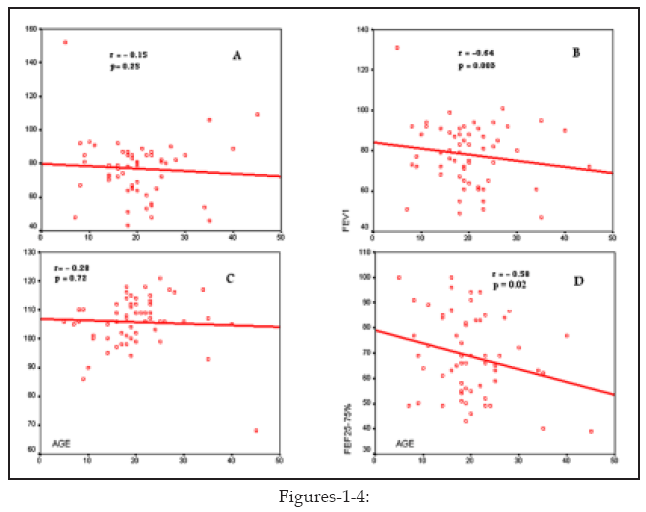 At simple regression analysis, there were negative correlations between FVC, FEV1, FEV1/FVC (FEV1 %), FEF25%–75%, and age of patients (Fig-1).