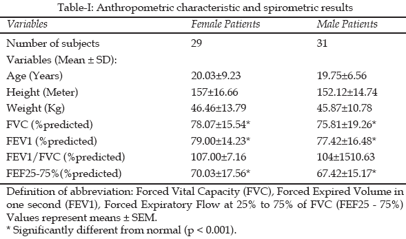 All of the 60 patients underwent full pulmonary function testing. Pulmonary function test results were normal in only 32 (53.3%) of 60 patients and the rest 28 cases (46.7%) showed abnormal pulmonary function. Among those 28 patients with abnormal pulmonary function, 25 patients (89.23%) showed restricted pattern. Out of those 25 only 10 patients (40%) showed moderate restricted pattern and the rest 15 (60%) showed severe restricted pattern. The means and SEM of pulmonary function test results, age, height, and weight of the patients are shown in Table-I. The means and SEM for relevant blood variables in study groups are shown in Table-II.