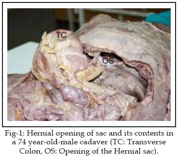 This case was a 74 year old male cadaver. During the routine abdominal dissection it was observed that major omentum and tranverse colon could not be found in its normal anatomical location. Approximately 20 cm part of the transverse colon was passed through to the thoracic cavity from the opening of diaphragm. It was detected that the transverse colon had migrated into hernial sac from the opening that occupied at the right front side of diaphragm and was 12cm deep. Opening was the oval shape occupied at the right side from the midline at retrosternal region. Antero-posterior diameter of the opening was 5.5cm, transverse diameter was 6.5 cm (Fig 1).