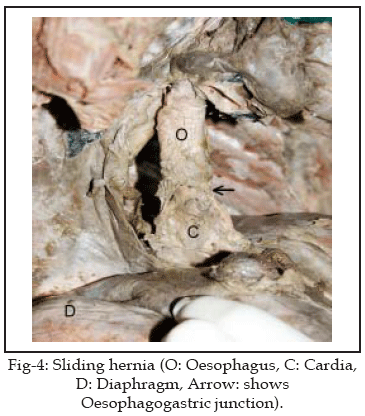 This apperance was in accordance with the sliding hernia among the hiatal hernias (Fig 4). Detailed dissection of great vessels, and heart did not show any anomaly. Other important observation was pectum carinatum dephormity carecterised by the specific apperance; sternum and costal cartilages showed prominece towards the front, and pressing wall side of the thorax .