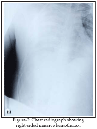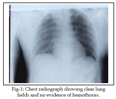 This-32-year old man was brought to the emergency department of our hospital having sustained multiple stab wounds over the anterior aspect of the right chest wall and extremities. On admission his blood pressure was 90/60 mmHg, with a pulse of 80 beats per minute and respiratory rate of 18 per minute. He was hemodynamically stable. His breath sounds were equal bilaterally, without rhonchi or rales. The heart sounds were regular, and, there were no murmurs, rubs, or gallops. Chest radiograph taken on admission did not show any marked abnormality (Fig-1). The emergency routine laboratory investigations were normal.