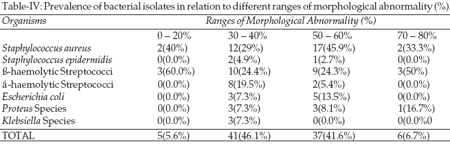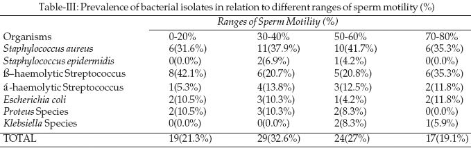 Also semen samples with sperm motility of the range 30- 40% yielded the highest number of bacterial growth while those within the range 70- 80% motility yielded the least (Table-III).