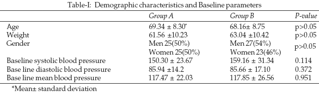 Comparison of the results of systolic, diastolic and mean blood pressure between two groups showed that only in one case in Group-A (diastolic blood pressure of the 1