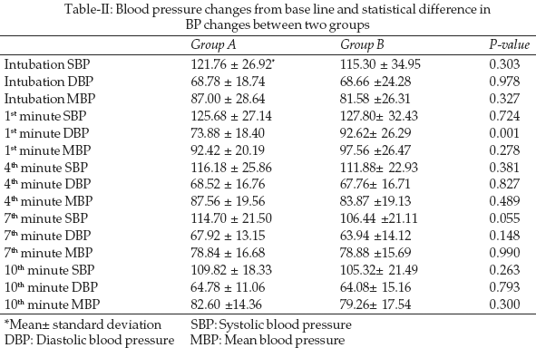 st minute after intubation), a significant decrease in blood pressure occurred, as compared with Group-B (P=0.001). But in other cases there was not statistical difference between blood pressures (Table-II).