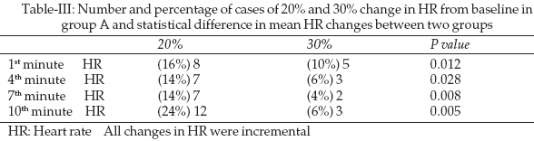 Comparison of BP changes higher than 20% from baseline between two groups showed that except of diastolic hypotension at first minute after itubation in one case.(P=0.01) number of systolic, diastolic and mean hypotension higher than 20% from baseline were significantly more in group B than group A. These include: Systolic BP during intubation (P=0.43) Systolic BP at 4th minute (P=0.027) Systolic BP at 10th minute (P=0.005) and mean BP at 10th minute after intubation. Comparison of BP change higher than 30% from baseline between two group showed there was not any significant difference unless in systolic BP at 4th minute after intubation. (P=0.009). The mean HR changes were significantly higher in group A than group B at all minutes after intubation. (Table-III)