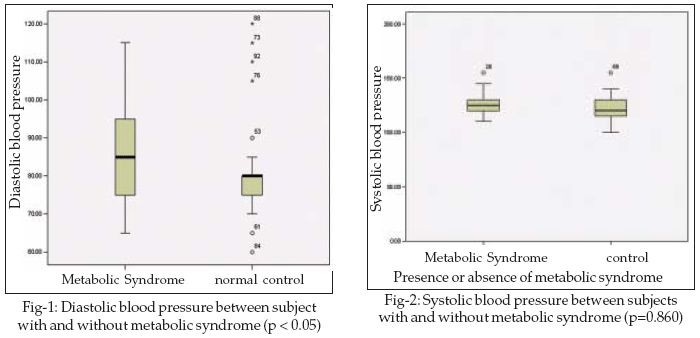 The diastolic and systolic blood pressures were higher in subjects with metabolic syndrome in comparison to age and sex matched controls (p<0.05 and p=0.860); however statistical significance was not reached in case of systolic blood pressure (Fig-1 & 2).