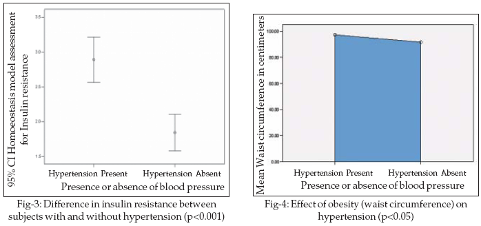Waist circumference was used as a marker of obesity, which demonstrated significant differences between subjects with and without hypertension (Fig-4).