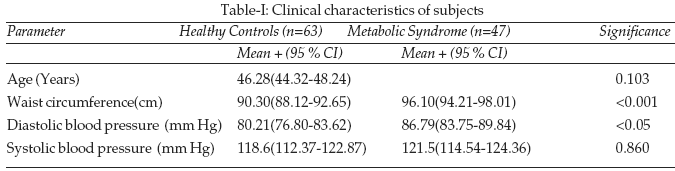 Methodology: It is a comparative cross-sectional study which was carried out between April 2004 to March 2006 at department of chemical pathology and endocrinology, Armed Forces Institute of Pathology, Rawalpindi. A total of sixty-three subjects with metabolic syndrome were selected as per the criteria of National Cholesterol Education Program, Adult Treatment Panel III (NCEP, ATP III) from a target population diagnosed to have impaired glucose regulation at AFIP, along with forty-seven age and sex-matched controls. Insulin resistance was calculated by the method of HOMA-IR, using the formula of Mathew’s et al. Blood pressure was measured as per recommendations of JNC7 report on prevention, detection, evaluation and treatment of high blood pressure.