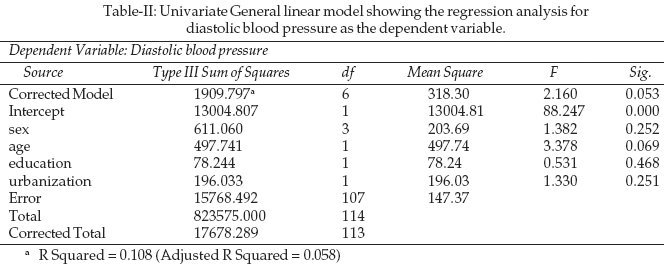 Hypertensive individuals irrespective of their inclusion in metabolic syndrome, were found to have higher insulin resistance [(n=33): 2.87 (95 % CI: 2.37-3.05)] than non-hypertensive individuals[(n=30): 1.76(95 % CI: 1.53-2.05)] (p<0.001), as Fig-3. The general linear model showed the effect of urbanization, sex, age and education to be non-significant in the development of diastolic blood pressure (Table-II).