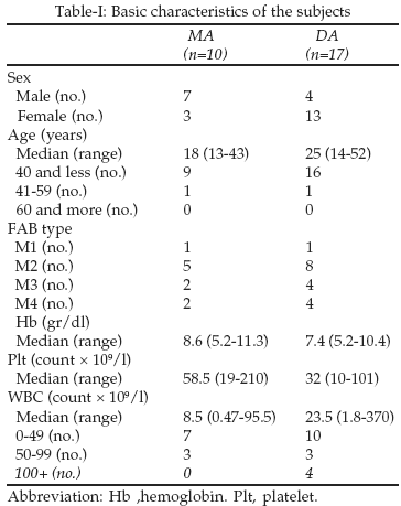 A total of 29 patients were recruited for this study. Two patients, one from each treatment arm, were excluded because of early death. Of 27 remaining subjects, 10 were randomly allocated to the MA treatment arm and 17 to the DA treatment arm. Patients and disease characteristics of the subjects is presented in Table-I. Two groups of patients were almost similar. The study sample comprised seven males and three females in MA group with median (range) age of 18 (13-43). The same figures were four males and 13 females with median (range) of 25 (14-52) in DA group.