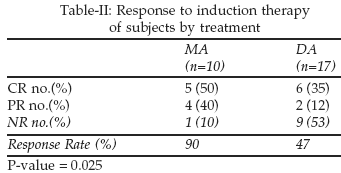 Table-II shows the response rates to induction therapy of subjects by treatment. As seen in the table, five (50 percent) of the MA group achieved CR and four (40 percent) achieved a PR giving an overall response rate (CR+PR) of 90 percent. The same overall response rate was significantly lower in DA group (P=0.025).