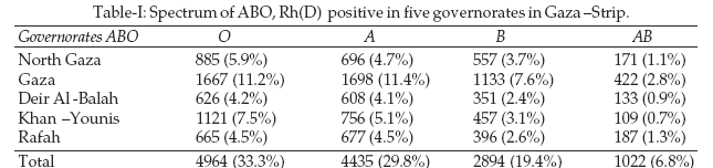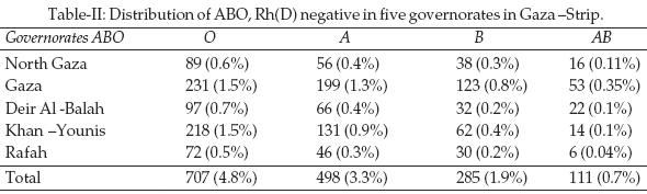 Conclusion: The frequency of ABO blood groups in both Rh positive and negative subjects among the five governorates in Gaza-Strip was O>A>B>AB, except in Rafah and Gaza city governorates where the blood group A was the commonest among Rh positive subjects.