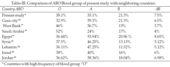 and Kuwait.7-12 However, other countries such as Syrian Arabs, Lebanon, Israel, Jordan and Tehran13-17 have a different ABO spectrum in which blood group-A is the predominant (Table-III).This spectrum difference may be attributed to sampling error, genetic factors,