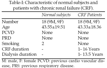 Subjects: Eighteen CRF patients as study group and 18 normal subjects as control group were selected. CRF patients were recruited from hemodialysis unit, department of nephrology, Ghaem hospital Mashhad,Iran and normal subjects were selected from visitors of the Ghaem hospital. None of the subjects had previously diagnosed respiratory or cardiovascular disease. Only two normal subject of control group were smoker (Table-I). The duration of chronic renal failure and hemodialysis in the patients was between; 1 to 16 and 1-13.5 years respectively (Table-II).