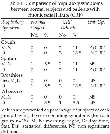 43.33ą18.36 years) was not significantly different with that of normal subjects (meanąSD age 43.55ą19.51 years, Table-I).Comparison of respiratory symptoms and PFT values between patients with chronic renal failure and normal subjects. Respiratory symptoms in CRF patients including cough, sputum and breathlessness, were significantly higher than normal subjects (p<0.01 to p<0.001, Table-II). In fact 39% of eighteen patients with CRF (7 patients) had respiratory symptoms compared to 6% of control group (1 subject). In addition all PFT values (FVC, FEV
