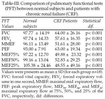 1, PEF, MMEF, MEF75, MEF50, & MEF25) in CRF patients were significantly lower than no- rmal subjects (p<0.001 for all cases,Table-III).