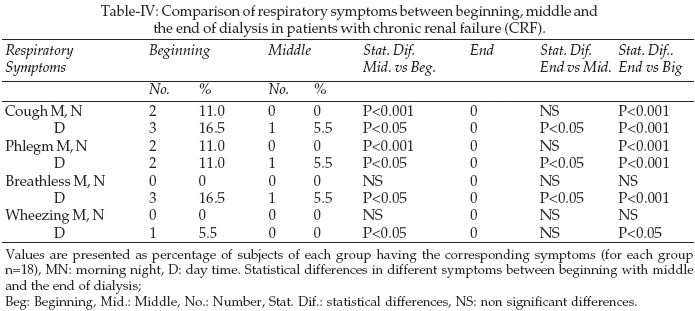The effect of hemodialysis on respiratory symptoms: All respiratory symptoms (cough, sputum, breathlessness and wheezing) of CRF patients in the middle and at the end of dialysis were significantly lower than the beginning of dialysis (p<0.05 to P<0.001, Table-IV). In addition, some respiratory symptoms (cough, sputum and breathlessness) were also significantly improved at the end compared to the middle of dialysis (p<0.05 for all cases, Table-IV).