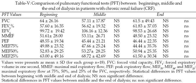 The effect of hoemodialysis on pulmonary function tests: The dialysis did not affect PFT values in CRF patients. There was no significant difference in PFT values of patients with CRF between beginning, middle and the end of dialysis (Table-V).