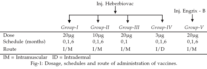 First four groups were injected with Inj. Heberbiovac while last Group-V was given Inj. Engerix-B in standard dosage (20µg) with schedule of zero, one & six months. In Heberbiovac arm, group-I was vaccinated with standard dose and schedule, while group-II was given half dose of (10µg) and in Group-III, (20µg) was given at zero and one month interval. Group-IV received intradermal Injection of (3µg) at zero, one and six months (Fig-1). The immunogenic response was measured in terms of antibodies titers (Anti HBs) eight weeks after the last dose and the results were compared (Table-I). All the tests were done using third generation micro particle immunoassay (MEIA)/IMX system by ABBOTT.