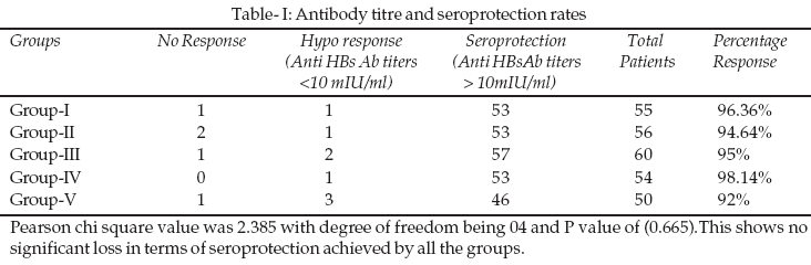 In Heberbiovac group, the Group-I achieved 96.36% seroprotection rate in Group-II it was 94.64%, in Group-III 95% and in intradermal group 98.14%. In Engerix –B group it was 92%. These results were subjected to Chi square test in SPSS version 10, the pearson chi square value was 2.385 with degree of freedom being 04 and P value of (0.665). This shows no significant loss in terms of seroprotection achieved by all the groups (Table-I).