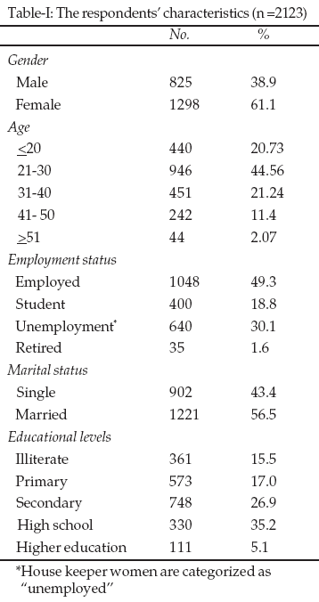 Respondents’ demographic characteristics: Two thousand one hundred and twenty three people (61.1% female and 38.9% male) participated in the study. They were aged 15–64 years. The demographic data of participants is shown in Table-I.