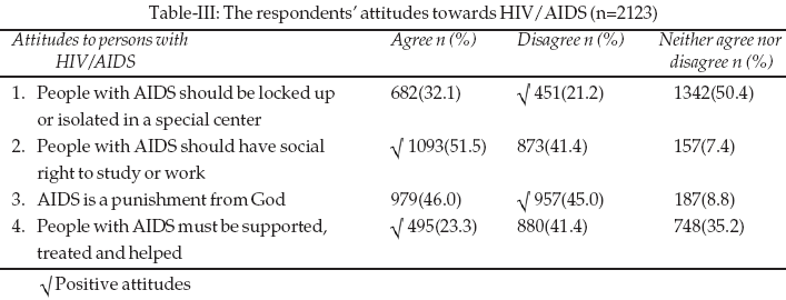Negative attitudes toward HIV-infected individuals were common. The majority of the respondents thought that AIDS is a punishment from God (46%). Nearly forty-two percent of the respondents disagreed with the statement that people with AIDS must be supported; treated and helped. Nearly forty-two percent of the respondents believe that people with AIDS should not have social right to study or work. About 32% of the respondents stated that people with AIDS should be locked up or isolated in a special center. The results are presented in Table-III.