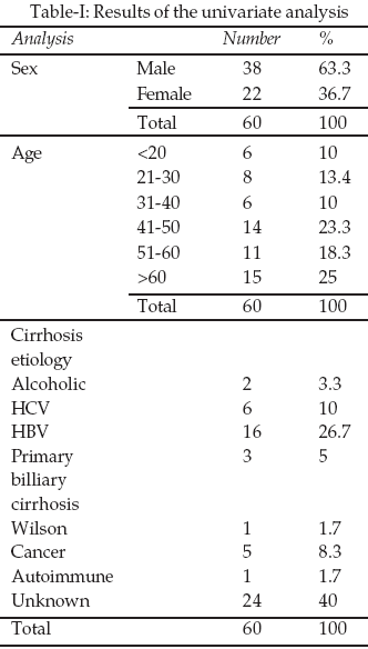 A total sixty cirrhotic patients who attended the gastrointestinal clinic during twenty month study period were enrolled in the study. Thirty eight patients were male and twenty two female with mean age+-sd, 47.22+-17.12(15-72) years. Table-I shows the age, sex and etiology of patients.