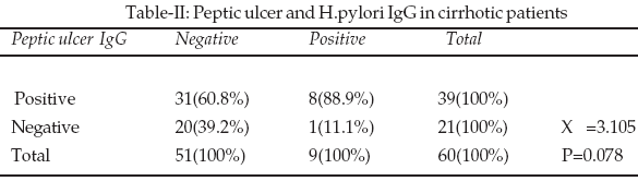 Active peptic ulcer was detected in nine cirrhotic patients by means endoscope (model GFI-XQ230). Of the nine patients with peptic ulcer eight (88.9%) tested positive for Helicobacter pylori antibodies and of the remaining 51 patients, thirty one (60.8%) tested positive for Helicobacter pylori antibodies (Table-II). Peptic ulcer was detected in anterum, fundus and duodenal area.