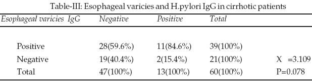 Esophageal varices were diagnosed in 13 of the 60 patients by means endoscope. Of the 13 patients with esophageal varices eleven (84.6%) tested positive for Helicobacter pylori antibodies and of the remaining 47 patients, twenty eight (59.6%) tested positive for Helicobacter pylori antibodies (Table-III).