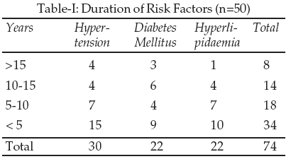 6,14 Patients were labeled as hyperlipidaemic if total serum LDL-cholesterol was more than 240mg/dl and triglycerides level was more than 200 iu/dl.11,15,16 Patients with past history of coronary artery disease, diagnosed and confirmed by the consultants were also recorded.17,18Investigation reports regarding blood pressure, fasting blood sugars and random blood sugars, cholesterol and triglyceride levels were also considered. Association of risk factors with stroke were studied. The duration from the onset to the date of reporting of risk factor was also recorded (Table-I).