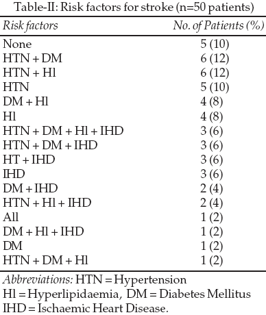 Results: Fifty patients with established diagnosis of stroke were selected; forty-three suffered from ischaemic stroke (86%) while seven fell into the category of haemorrhagic stroke (14%). Thirty-two (64%) patients had more than one risk factor. The age range of patients was from 17 to 80 years. Out of 50 patients twenty-nine (58%) were males and twenty-one (42%) were females. The commonest risk factor of ischemic stroke was hypertension (32.61%) followed by diabetes (23.91%), hyperlipidaemia (23.91%) & ischaemic heart disease (19.57%) where as in haemorrhagic stroke it was also high blood pressure (71.4%) and aneurysm (28.57%).