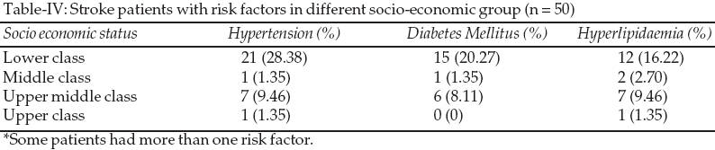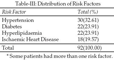 The commonest risk factor was hypertension (32.61%) followed by diabetes (23.91%), hyperlipidaemia (23.91%) and ischemic heart disease (19.57%) (Table-III). Co-existing risk factors included hyperlipid-aemia, hypertension, diabetes, addiction and ischaemic heart disease (Table II). The common risk factors in different socioeconomic group are given in (Table IV).