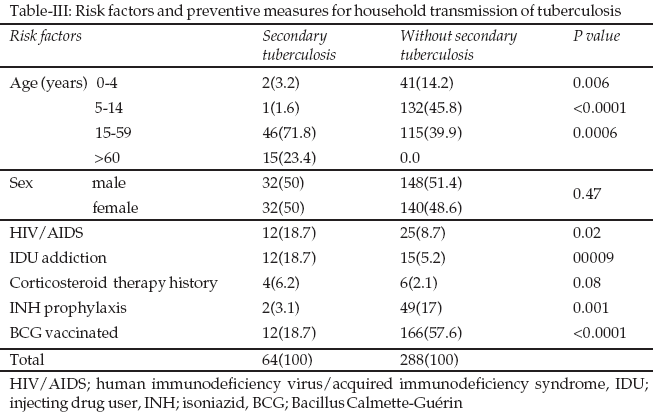 Risk factors for transmission and developing disease and efficacy of preventive measures are shown in Table-III. Increasing trend in age was associated with increased risk of TB in both the contact groups with significant differences (p<0.05). The prevalence rate of the disease in male and female was not significantly different (p>0.05). HIV infection and IDU addiction were important risk factors for tuberculosis in HC. Treatment with corticosteroid was associated with increased risk of tuberculosis, although that was not statistically significant. BCG vaccination and INH prophylaxis were effective preventive measures for TB in household contacts.