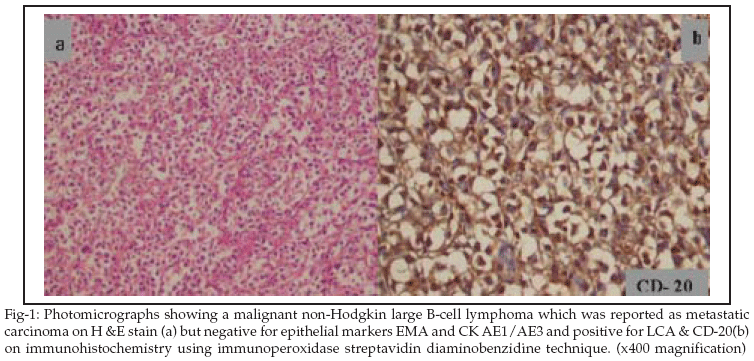 Thirteen (36%) cases were placed in category "C" (Table-I). Four cases were unfit for opinion either due to processing and fixation artifacts or fragmented nature of the biopsy. (Re-biopsy may be needed in some cases for a definite diagnosis). This was done after extensive deliberations in the form of deeper cuts or manual staining. A diagnosis of lymphoma was changed to carcinoma and vice versa after application of immunohistochemical stains in 2 cases (Fig-1).