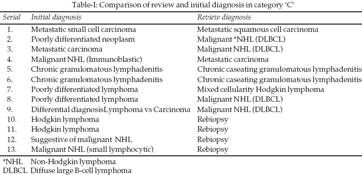 Methodology: Forty cases of lymph node lesions initially reported from different centres and referred for second opinion during the year 2005 were included in the study. Special stains and immunohistochemistry were applied and initial diagnosis was compared with the review diagnosis. The discrepancies were divided into different categories keeping in view the implications on patient management.