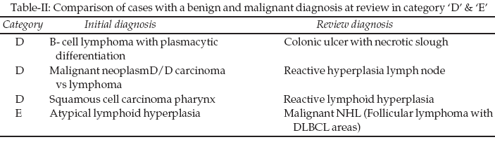 A change in diagnosis from benign to malignant and malignant to benign was seen in four cases which were in category "D" & "E" (Table-II).