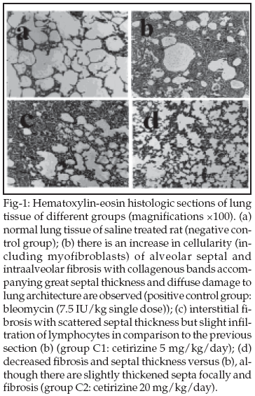2/bicarbonate buffer system.Histological examination: Lung tissue was fixed by 10% neutral formalin solution for paraffin slides and sectioned at approximately 5-ìm thickness. Tissue affixed to a glass slide deparffinized, rehydrated and counterstained with hematoxylin and eosin (H&E) staining. The slides were examined by light microscopy and photographed. The effects of fibrogenic agent i.e. bleomycin and the healing effects of cetirizine were investigated histologically. Lung tissues were taken from groups of control or treated animals which were also used for pharmacological investigations. Lung tissue samples were fixed, processed, cut and stained for routine light microscopy and histopathology.