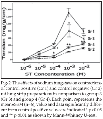 Studies on contractility of lung-tissue strips: Figure-2 shows the effects of sodium tungstate on contractions of lung strip preparations of the four groups of rats, including groups one, two, three and four. The figure shows that rats of group three and four had less contractions of lung strip preparations as compared to group one. The amount of contractions of lung strip preparations is less in group four as compared with group three.