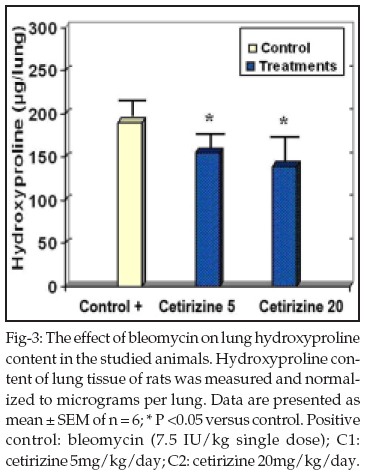 21In this study we measured the hydroxyproline content as an indicator to estimate the amount of collagen in the lungs. According to the results of this study (Fig-3), the amount of collagen in the lungs of groups received ceterizine (both 5 and 20mg/kg/day, IP), showed statistically significant differences in comparison to the control group (p<0.05). It seems that membrane stabilization plays the main role in this protective effect of ceterizine.