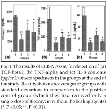 Studying the Cytokine Profile in the Studied groups: Figure-4 shows the results from the ELISA Assays, processed by the statistical software of the data from three studied cytokines in the four groups of rats, including groups one, two, three and four. The figures shows that rats of group three and 4 had less amounts of fibrogenic cytokines as compared to group one. The amount of these cytokines is less in group four as compared with group three.