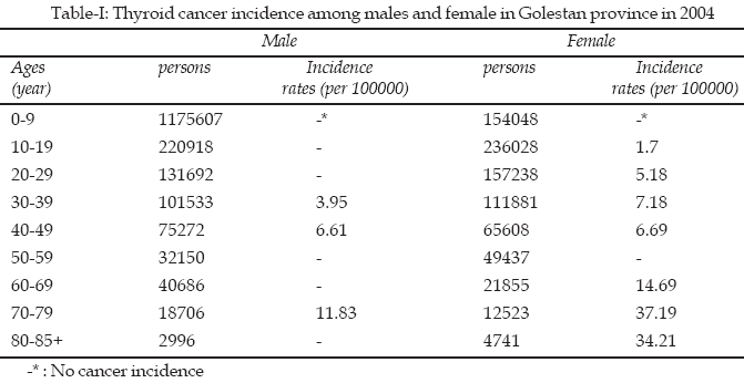The results from Golestan province Cancer Registry for the year 2004 show that cancer of thyroid is the sixth and fifth common cancer in women and men respectively. The Annual Specific Rate (ASR) is 2.65 and 0.75 per 100,000 in females and males respectively. The highest thyroid cancer incidence among females and males in Golestan province was in age group 70-79 (ASR: 37.19/100,000) and (ASR: 11.83/100,000) respectively. The thyroid cancer incidence according to age specific is shown in Table-I.