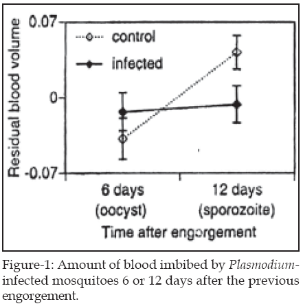 9 Corroborating this is the finding by Koella and co-workers10 that oocyst of P. gallinaceum decreased the blood volume that Aedes aegyti takes up for it to be satiated. Plasmodium infected mosquitoes took up less blood than uninfected mosquitoes if they had been starved for 6 days (when parasites would have developed into oocysts) (Fig-1).
