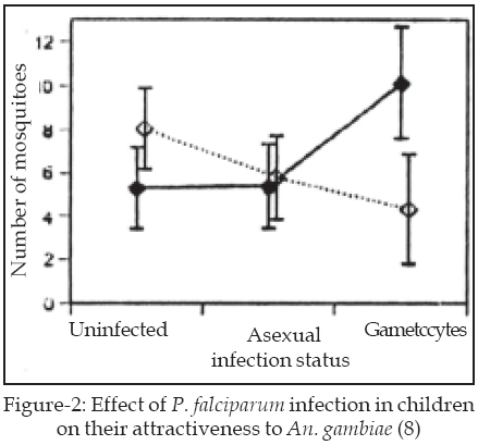8 investigated this issue and showed in a semi-natural experiment that children infected with gametocyte stages of Plasmodium attracted twice as many mosquitoes to themselves as the uninfected children and those harboring asexual stages (Fig-2). However, when infected children were treated, all children had similar attractiveness to mosquitoes.