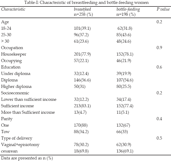 Study was carried out on 258 breastfeeding and 198 bottles feeding women. Breastfeeding women were similar with bottle-feeding in term of age, occupation, education, socioeconomic condition, parity and type of delivery (Table-I).