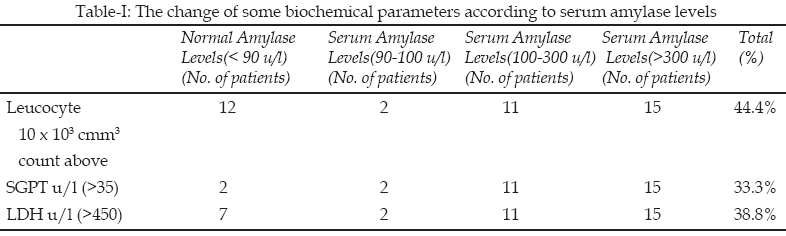 Total nine patients (10%) out of 28 with hyperamylasemia, had raised lipase levels (>60 IU), among them seven had less than two fold elevation of lipase while two patients had two fold elevation of lipase with a four fold increase in a repeat sample after 30 hours. Eight of 28 patients with manifested hyperamylasemia > 300u/l and one of 28 patients with moderate hyperamylasemia (100-300 u/l) also had hyperlipasemia. Among 90 patients 28 with hyperamylasia invariably had raised leucocyte count, raised SGPT and LDH. (Table-I)